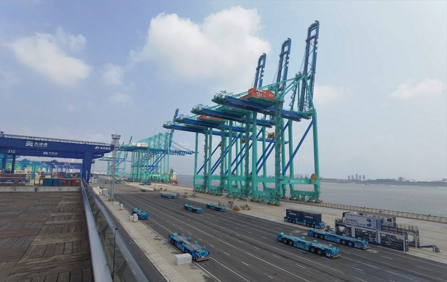 The Section C Terminal in the Beijiang Port Area of the Port of Tianjinwas the world’s first smart, driverless zero-carbon port terminal. It entered large-scale commercial operations in October 2021 and has been operating stably ever since.Using 5G and L4 autonomous driving technologies at the terminal makes operations safer and more efficient. At the terminal, remotely controlled quay cranes lift loaded containers from cargo ships and put them on intelligent robots for horizontal transportation. Supported by the BeiDou Navigation Satellite System, these robots are guided to automatic locking/unlocking stationsto load/unload containers and then to the container yard along optimal driving routes that are calculated in real-time. The entire process runswith clockwork precision.