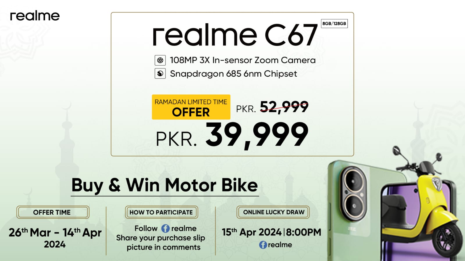 But the savings aren’t the only attraction realme is offering. In a bid to add more excitement to this festive deal, the smartphone manufacturer is also hosting a lucky draw. Customers who purchase the realme C67 during the promotional period have a chance to win an electric bike. To participate, buyers simply need to share their purchase slip in the comments section of the official realme Pakistan Facebook post. Lucky few will be selected as winners during a lucky draw on the 15th of April 2024. This unique blend of savings and thrilling rewards makes the realme C67 an even more enticing purchase this Ramzan season.