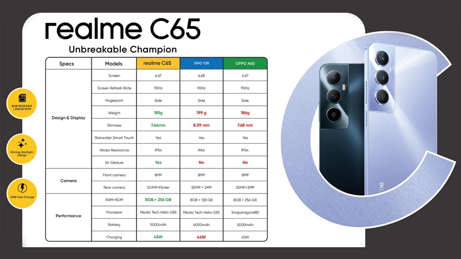 One of the standout features of the realme C65 is its massive 256GB storage capacity. This provides ample space for all your apps, photos, and videos. It also features DRE (Dynamic RAM Expansion) Technology, allowing the phone to expand its 8GB RAM up to 16GB, ensuring a smooth multitasking experience. In comparison, the VIVO Y28 and the OPPO A60 only offer 8GB RAM and 128GB storage, making the realme C65 a superior choice for those who need extensive storage.
