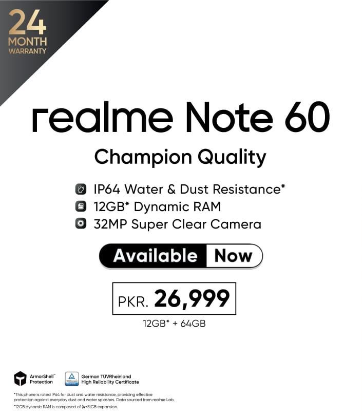 For those looking to embrace an active lifestyle with a smartphone as tough as they are, the realme Note 60 is available now for PKR 26,999.
