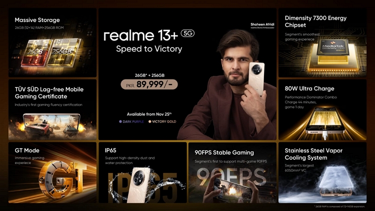 realme, the trailblazing smartphone brand, is thrilled to announce the launch of its latest innovation, the realme 13+ 5G, in Pakistan on November 25, 2024. Endorsed by Shaheen Shah Afridi, Pakistan’s cricketing sensation and fastest pacer, the realme 13+ 5G sets a new benchmark in smartphone performance, proudly equipped with the Dimensity 7300E processor, the fastest in its segment under PKR 100,000.