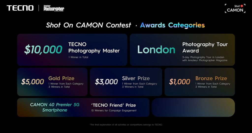 To ensure fair and expert judging the of Shot on Camon contest, TECNO has once again partnered with Amateur Photographer, the world’s longest-running photography magazine. Entries will be evaluated by a panel from both TECNO and the magazine based on instant capture ability, emotional impact, use of light and color, composition and image quality.